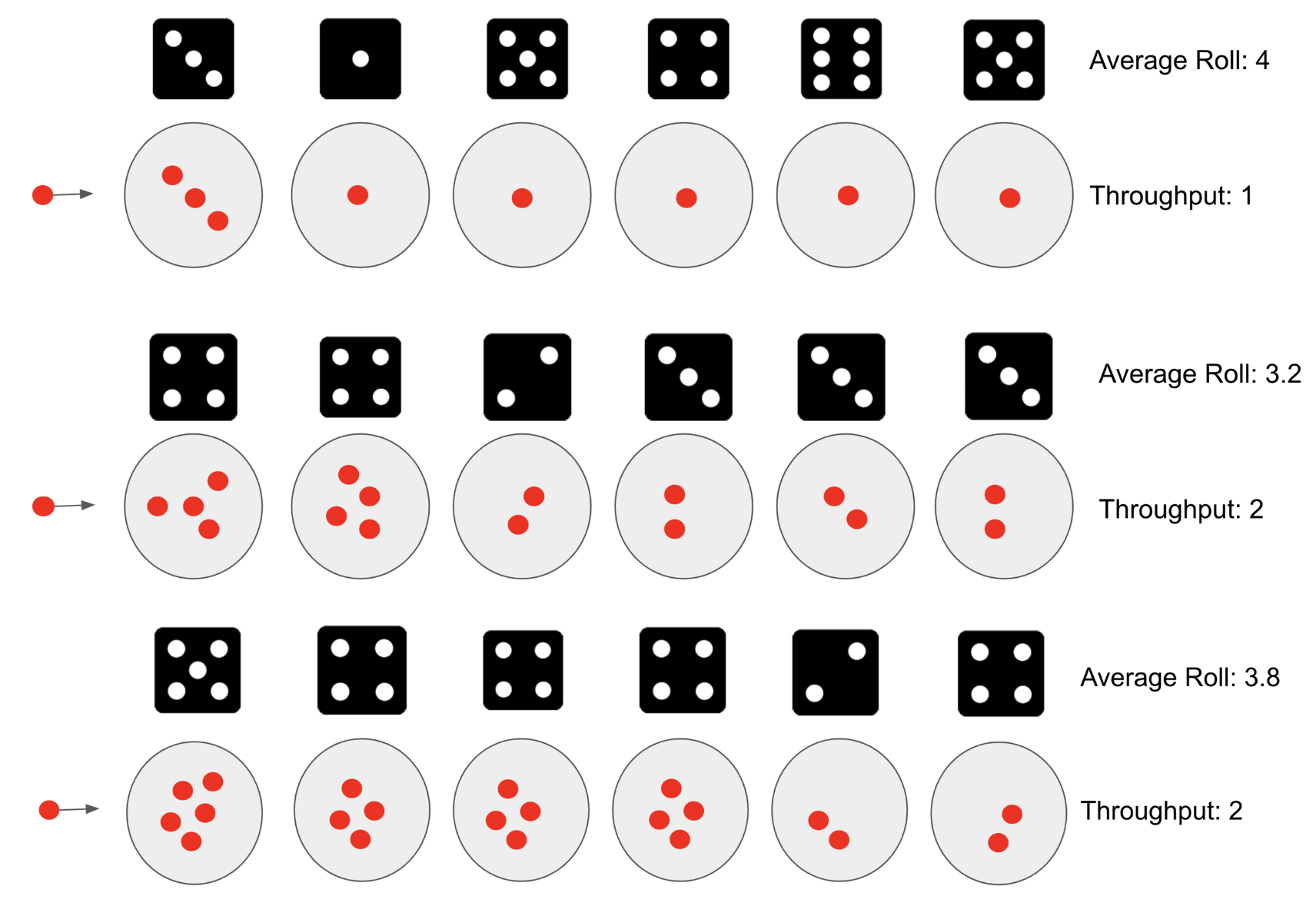 Delays occur, but how, when, and why? Delays occur due to a combination of statistical fluctuations and dependent events. As written in The Goal, Statistical fluctuations can simply be described as variability. If we go back to the analogy described by Goldratt, there will always be variations in the outcome of rolling a die. Six sides mean six different possible numbers to roll. All of the different outcomes are statistical fluctuations, but we can always guess that we will roll an average of 3.5 (the average of rolling a six-sided die six times). Dependent events are moments or queries that are affected by what happened before the event occurs. Life in the world of managing manufacturing becomes harder when you combine statistical fluctuations with dependent events. Below is an example of what happens when you combine the statistical fluctuations of rolling a die with the dependent events on the shop floor. In a domino effect, we can see how the throughput of one job affects the next job.